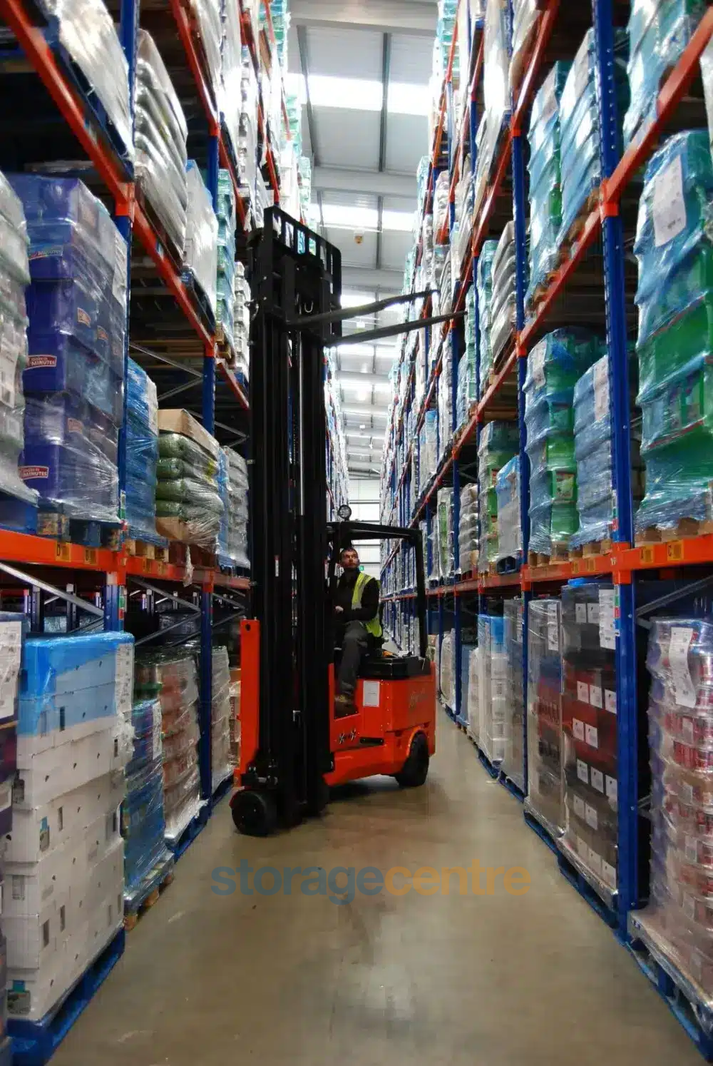In this system, the working aisles are narrower than standard pallet racking layouts, meaning more racks can be installed in the same area. Articulated forklifts enter and operate within these compact aisles to handle pallets quickly and safely.