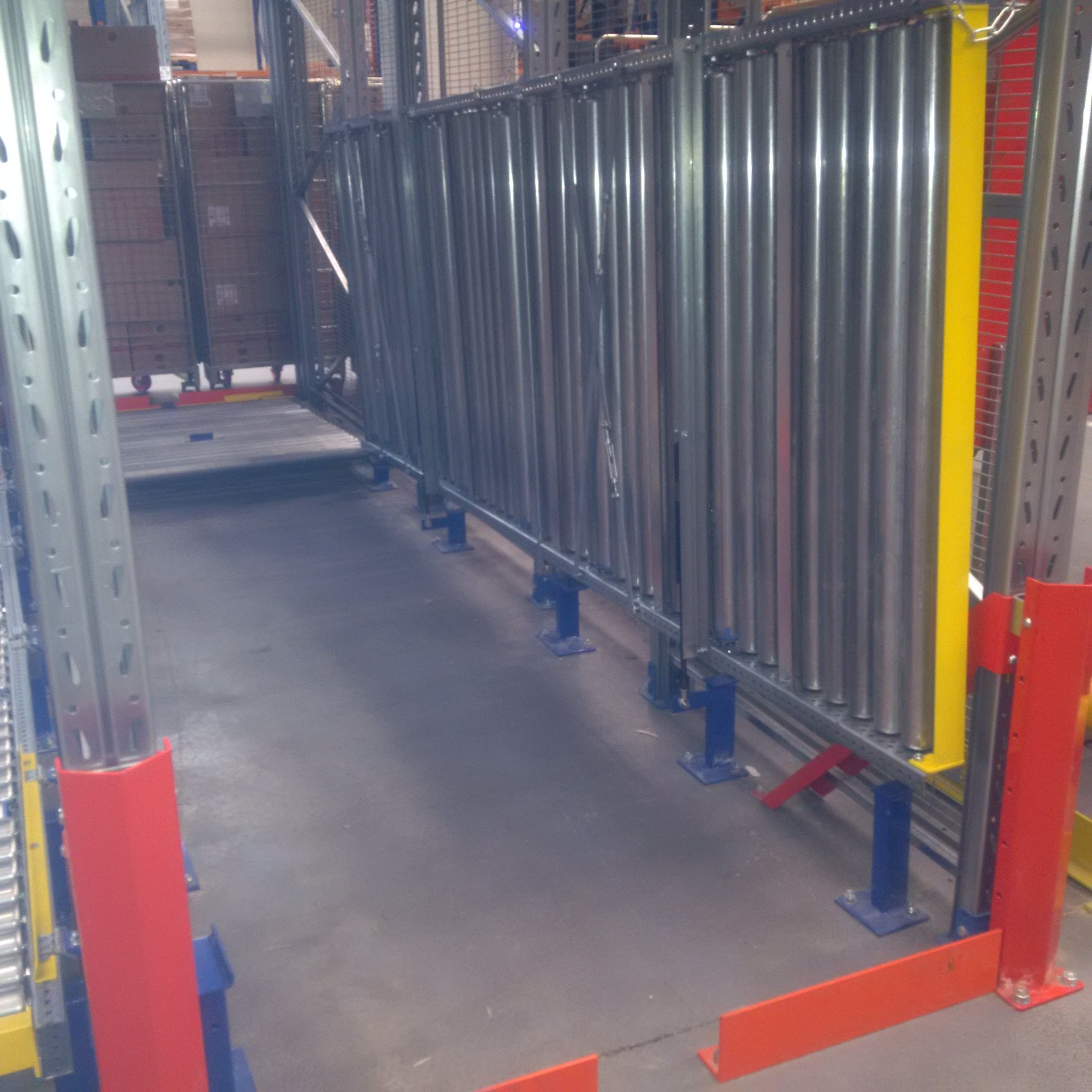 In this system, pallets are loaded at the higher end of the racking and roll forward under controlled speed to the unloading side. The movement is regulated by braked rollers (either direct or indirect), ensuring smooth and safe pallet transfer. Depending on the warehouse requirements, roller beds can be configured as twin track or full-width rollers, with roller type and pitch selected based on the pallet size, weight, and quality.